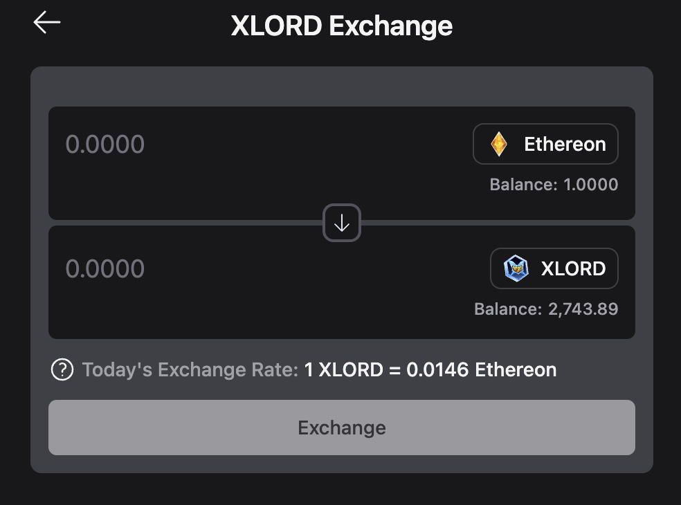 <figure><img src="https://1296202322-files.gitbook.io/~/files/v0/b/gitbook-x-prod.appspot.com/o/spaces%2FicnpHETzO6qPk2ldVMVb%2Fuploads%2FJvVVetSe1V7mFTdwQDdl%2Fimage.png?alt=media&#x26;token=b5b4ae2d-e1ea-4433-9730-fb469c53716e" alt="" width="375"><figcaption><p>Exchange Ethereon to XLORD</p></figcaption></figure>