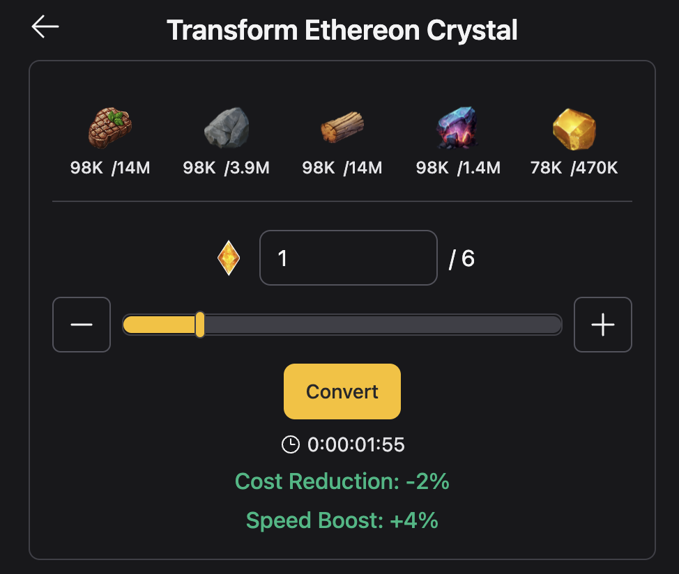 Note: Players can leverage Hero skills to reduce transformation time and resource requirements. Acquiring and upgrading Heroes with specific attributes can significantly enhance the efficiency of Ethereon conversion.